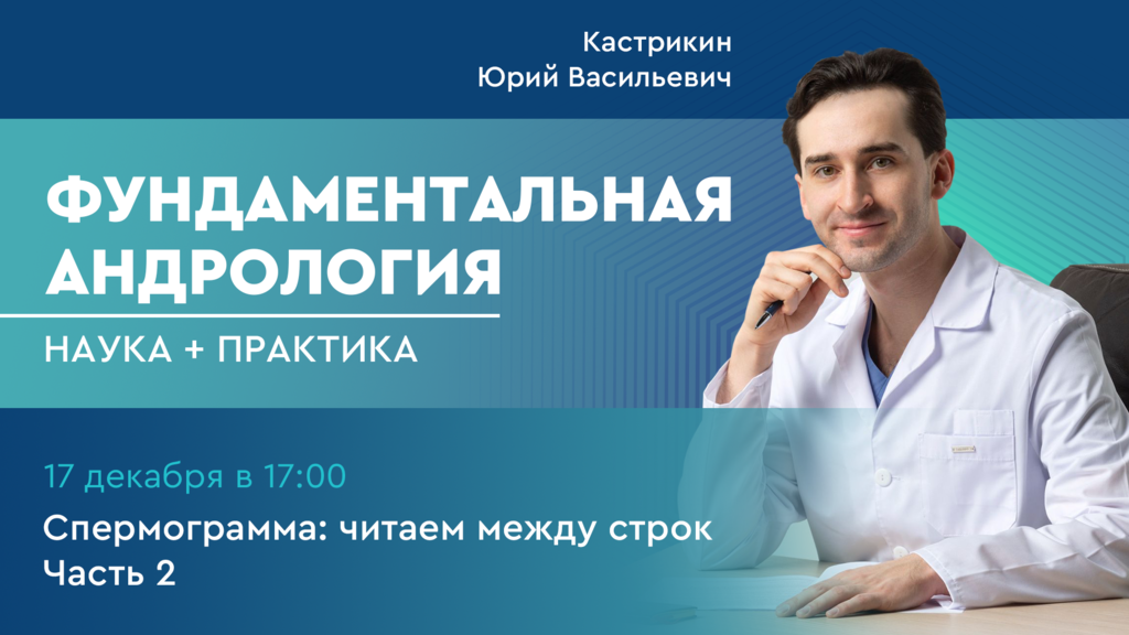 Приглашаем присоединиться к трансляции четвертого выпуска нового авторского проекта Кастрикина Ю.В. «Фундаментальная андрология: наука + практика» на тему «Спермограмма: читаем между строк. Часть 2», которая состоится 17 декабря в 17:00 по московскому времени.