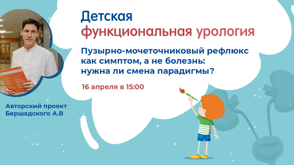 Приглашаем присоединиться к трансляции очередного выпуска авторского проекта Бершадского А.В. «Детская функциональная урология» на тему «Пузырно-мочеточниковый рефлюкс как симптом, а не болезнь: нужна ли смена парадигмы?», которая состоится 16 апреля в 15:00 по московскому времени.